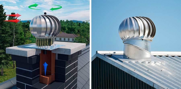 Активная головка дефлектора, вращаясь, создает разряжение в вентиляционном канале, за счет чего усиливается тяга и вентиляция работает эффективно.